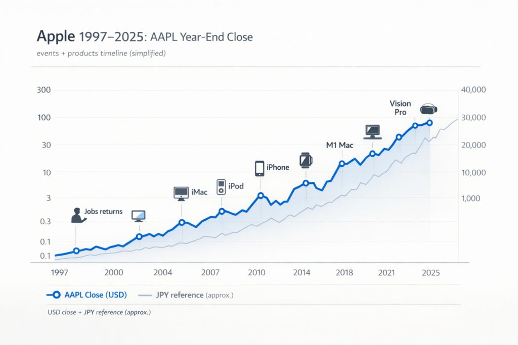ここから先は、1997年以降の「主な出来事/新製品」と、AAPLの年末終値(USD)+円換算(参考)を、同じ表に並べて眺めます。“読み物”としての表です。
